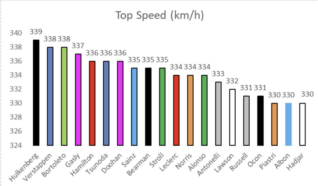 Each bar below represents the fastest trap speed of every driver, colored by their 2025 team livery.