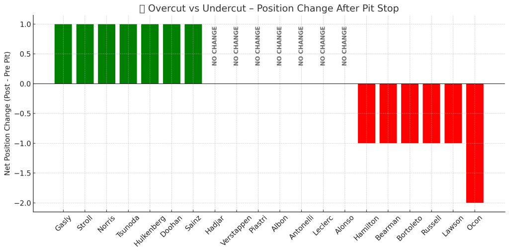 - Norris (+1): Gained a place after pitting later than Russell and jumping him with the overcut.