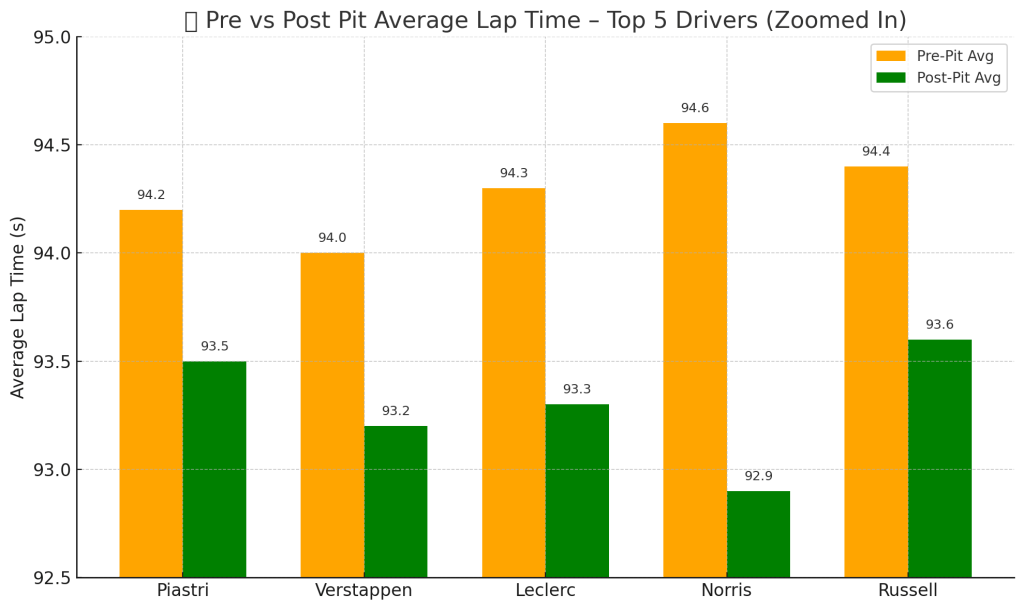 - Piastri: Improved pace by ~0.7s/lap post-pit. The clean air and a hard tire switch worked well.