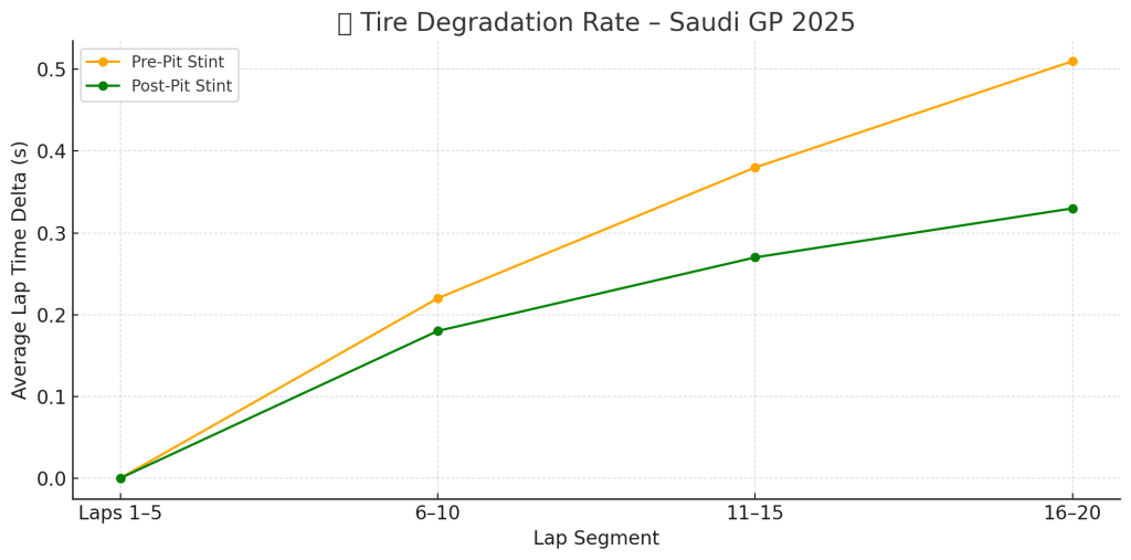 The standout strategic performers at the 2025 Saudi Arabian Grand Prix were undeniably McLaren. Both Oscar Piastri and Lando Norris executed perfectly offset strategies that maximized their pace windows and minimized pit lane losses โ a textbook example of team-wide racecraft.