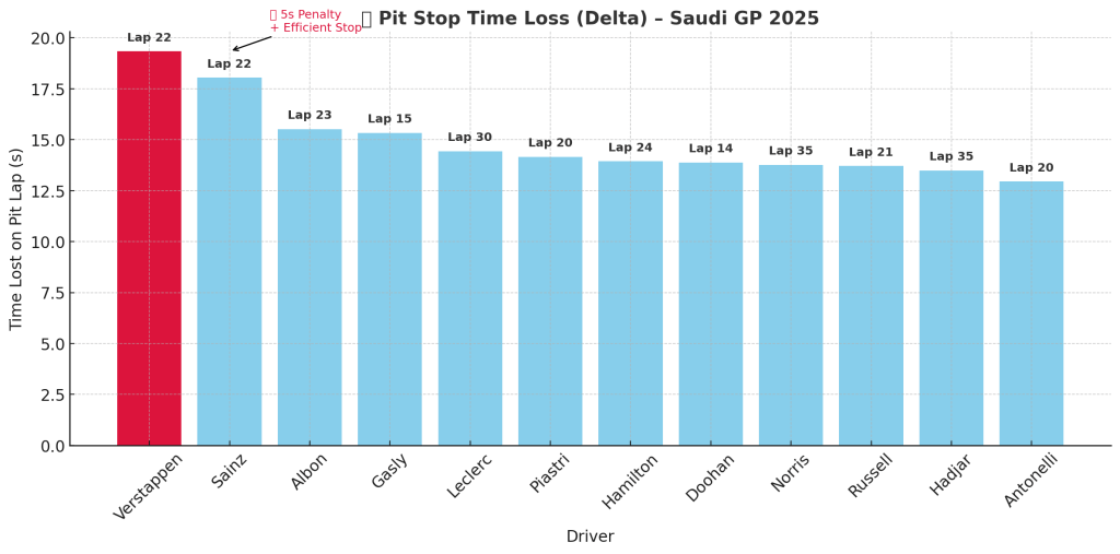 - Verstappen (19.33s): Highest loss due to the 5-second penalty, but still rejoined in P2.