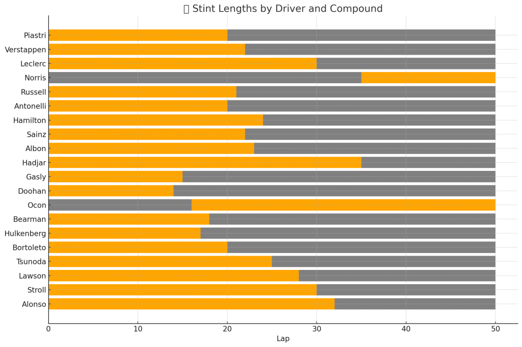 Piastri started on mediums, pitted early on Lap 20, and rejoined in clear air, avoiding traffic while keeping degradation low. Norris, meanwhile, flipped the strategy โ starting on hards, extending deep into the race until Lap 35, and using a light-fueled car on mediums to gain track position with a powerful overcut on George Russell.